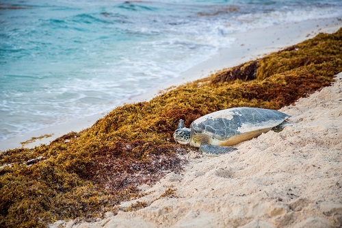 Green Sea Turtles travel between seagrass feeding areas and tropical nesting beaches.